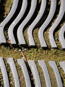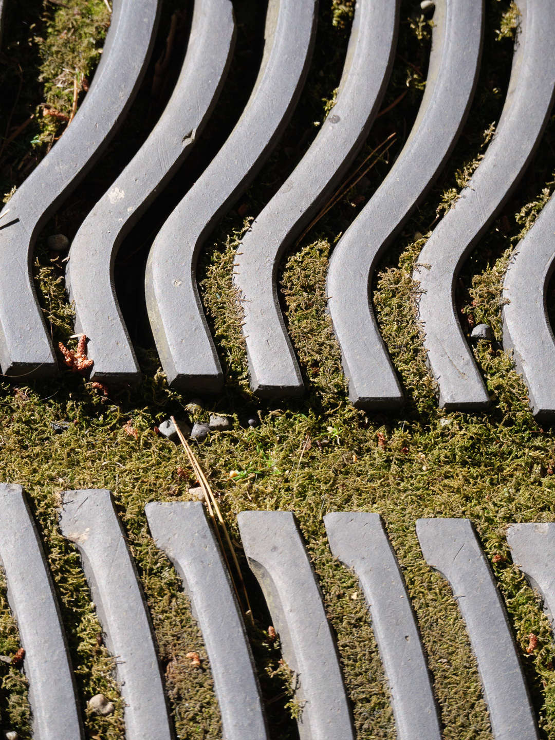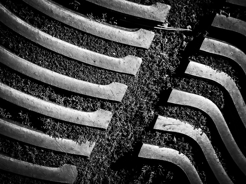 I viewed this pattern more as an industrial something or other. In particular, converting it to b/w and increasing the contrast changes the moss in the above to a gritty floor in the version at left. Curious how the waves above become almost threatening in the jaws or teeth of the image at left.