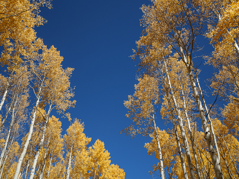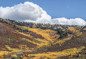 Sometimes, the best clouds are the ones that aren't in the picture. After photographing lots of hillsides of yellow leaves, I decided to look up. The version at left has no clouds, but I like the way the blue sky sets off the yellow leaves. In this case, the insertion of a cloud into the composition would not help.