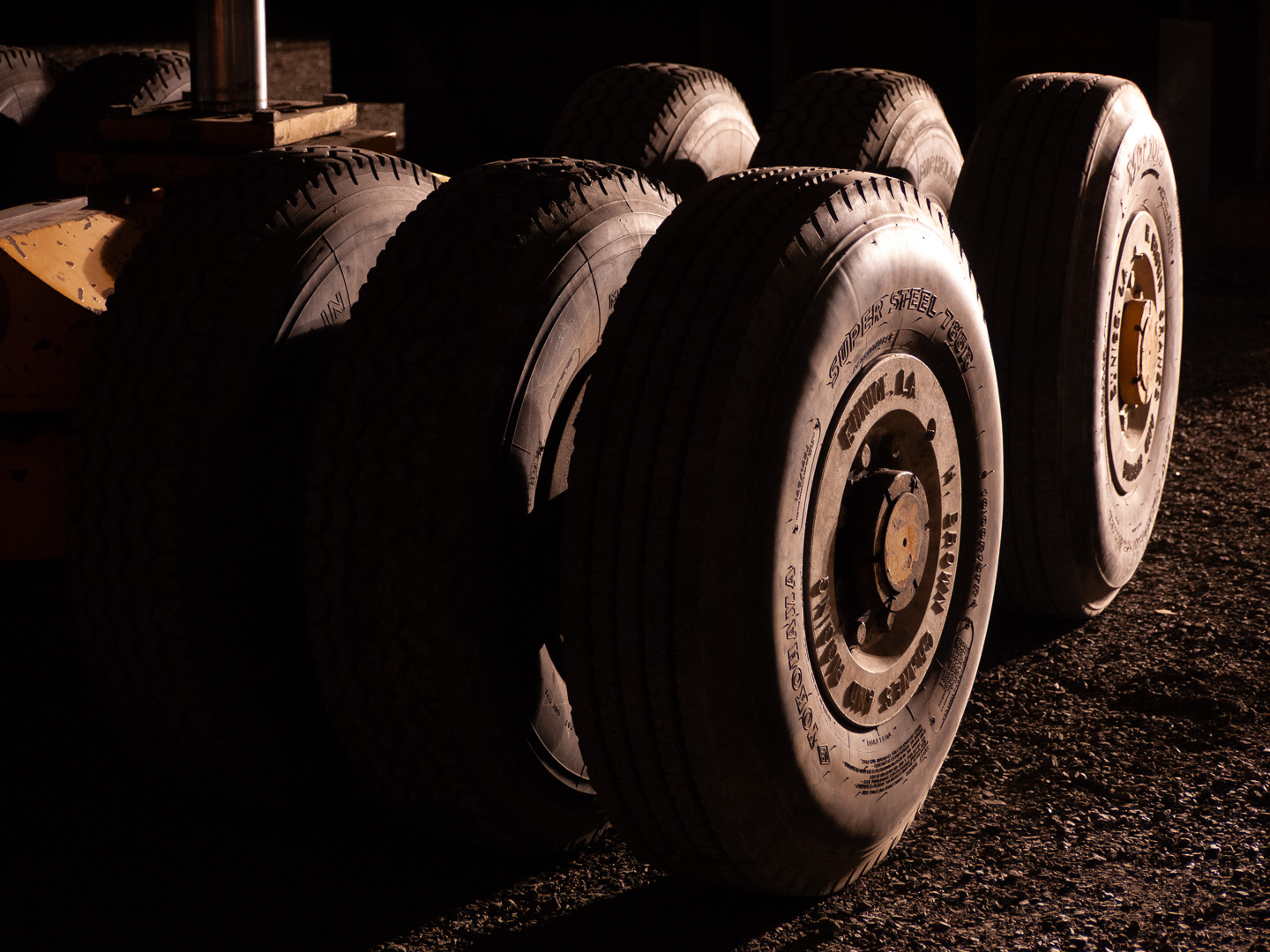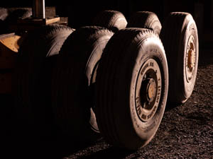 Color balance with artificial lights can be very tricky. Here we see an orange hue to these black tires that comes from the light source, in this case a street light that shines into the shipyard. By converting to b/w, the image looks "normal" and even dated. This helps this image feel like it belongs in a film noir picture. |
