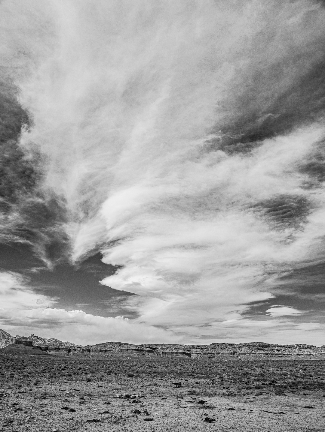 After converting to a monochromatic rendition, it was easy to add contrast and texture to the clouds. Still, the land was bland. I made a selection of the foreground and punched up the contrast and clarity to bring the land a bit more life. Interestingly enough, that makes the clouds even more dramatic. This is a common occurrence in my landscape photography — that there are two areas (sky and land) that require different processing to make them look right and still blend together in the image. |