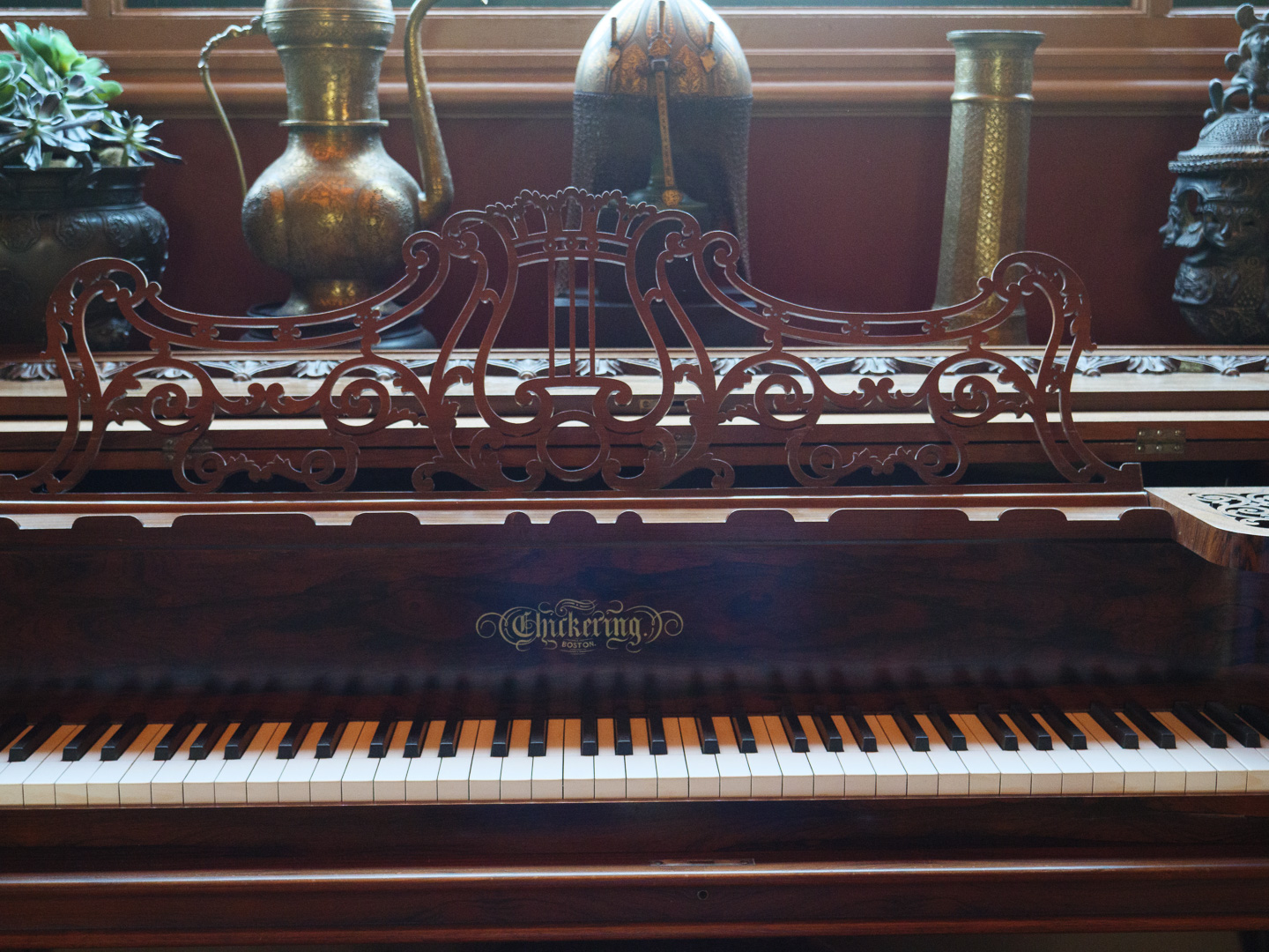 In retrospect, I know better. I should have taken half and hour or so to just walk around, looking in the various rooms and assembling a rough "shot list." Not a bad practice and one that slows down the process. The image at left is the result of looking more seriously at the piano and paying attention to the edges, the light, the textures, and reflections. Lesson for myself: Excitement is good, but too much excitement just leads to frenetic sloppiness. |
