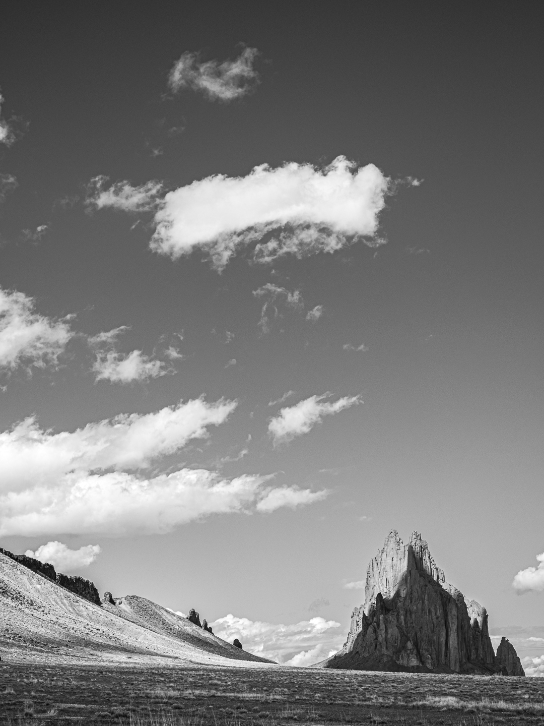 I was waiting for that rectangular cloud to center itself in the frame. As it move into the perfect position, another cloud cast its shadow on the face of Shiprock. Sometimes the photo gods smile on us.