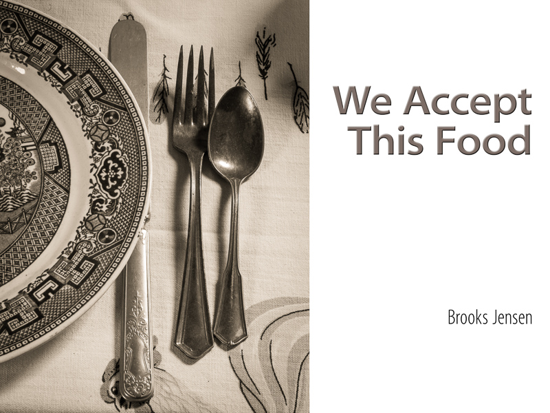 The idea came from a mealtime prayer. Every culture, every peoples, every religion includes a meantime prayer. I did a little Internet research and found several which I combined with my photographs in this project, We Accept This Food. Here is the link to the PDF.