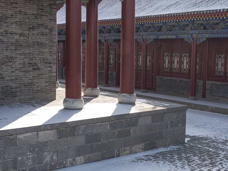 In a Chinese temple, wonderful red columns and those shadows on the skiff of snow.