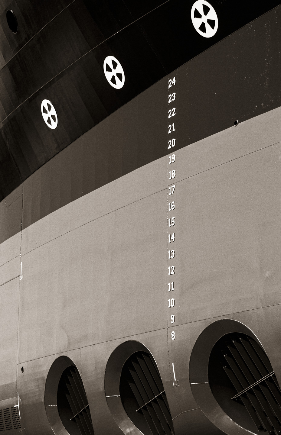 Most compositions have a dominant element. I'm not talking about the "subject" versus the background, but rather something in the picture that is the element that directs our eye movement through the image. In this case, it's the depth guage numbers on the hull. Because of that visual dominance, I think this works better as a portrait orientation image.