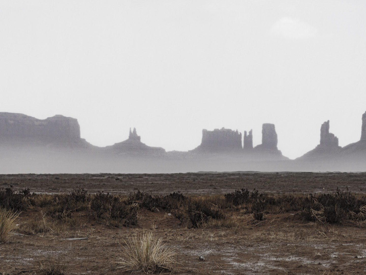 A smoky, rainy, misty day in Monument Valley.