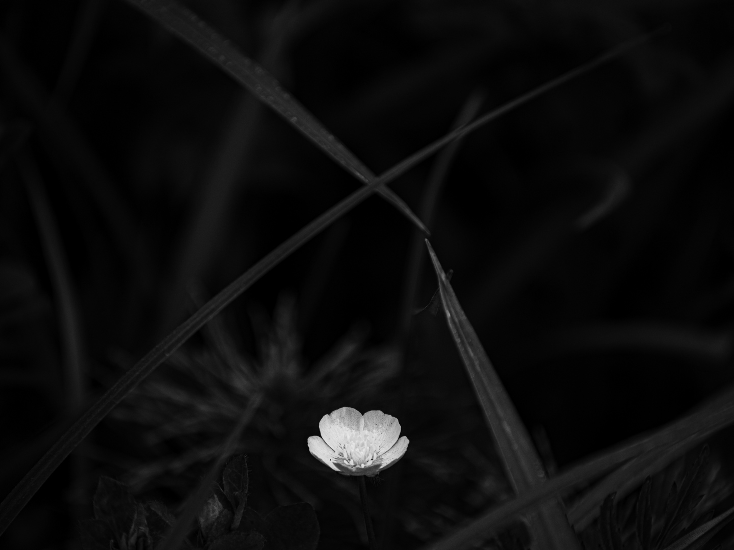 Those same intense, contrasting colors can also, however, be easily processed into powerful b/w images. I much prefer the rendition at left — which would have been far more difficult if the petal had been green, or the grass in the background yellow. I was able to push down the green to created those dark gray elements which make the now-white flower pop.