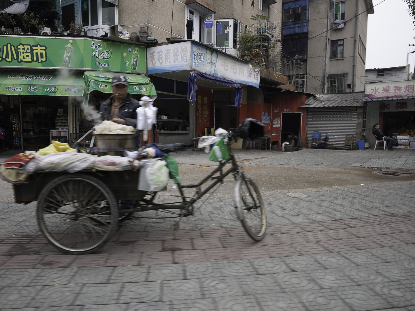 During my last trip to China, with every shot from the moving car, I used 1/2,500th of a second with high ISO. I thought that might be the trick to getting sharp images. I worked, sort of, but I then discovered that composing an image at the speed of traffic was an unanticipated challenge. I did get some sharper images, but often the camera grabbed focus from the wrong thing in the frame. As I say, I give up. Just stop the car and let me get out.
