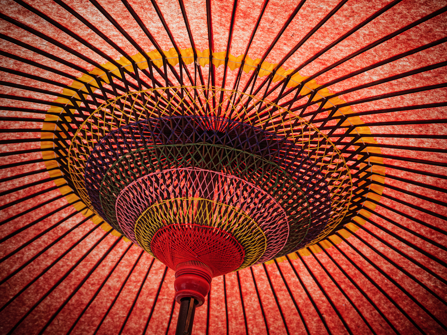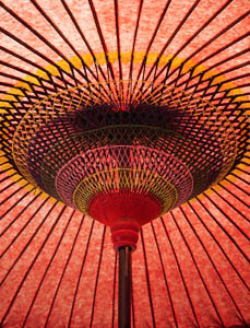 Beautifully intricate umbrella over a patio table at the Portland Japanese Garden.