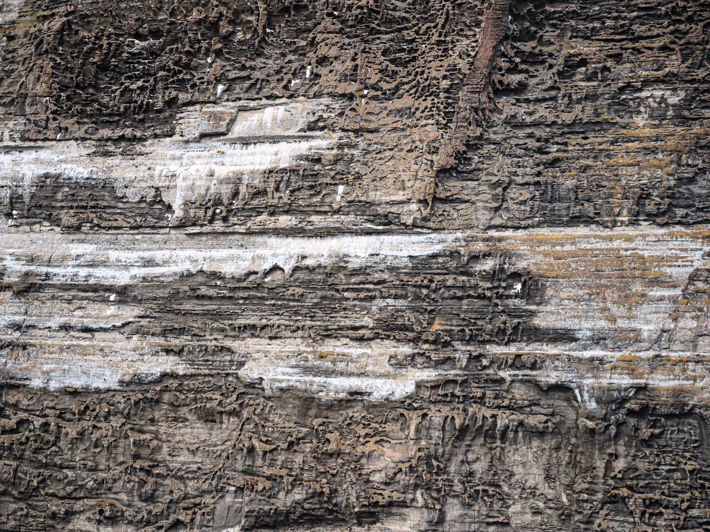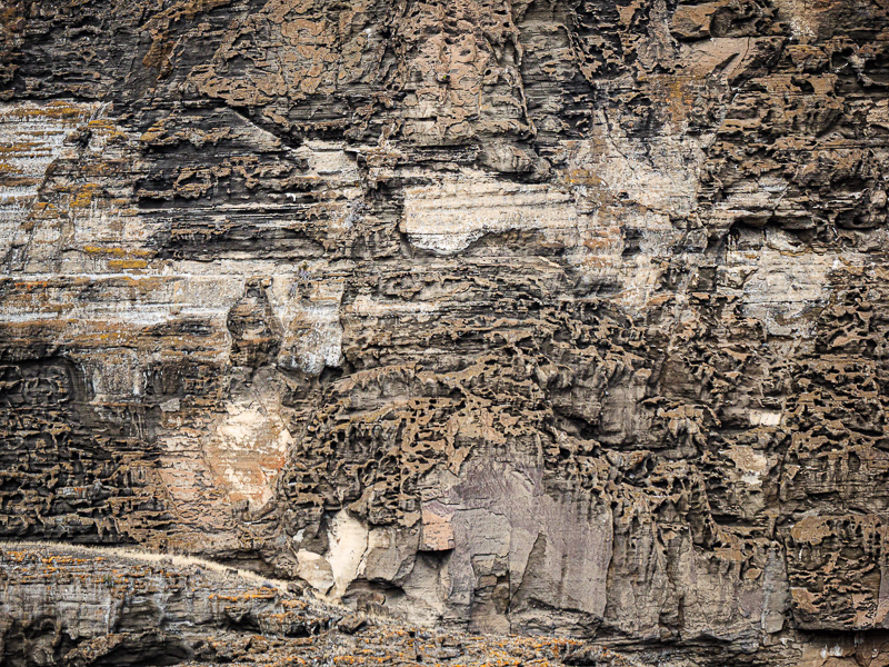 There is a huge wall of detailed rock that looks like it was bubbles in the lava that cooled. (I'm not a geologist.) I thought they were very like hieroglyphics that might be found on an Egyptian pyramid. At left are two different sections of that wall that I find interesting as abstracts. |