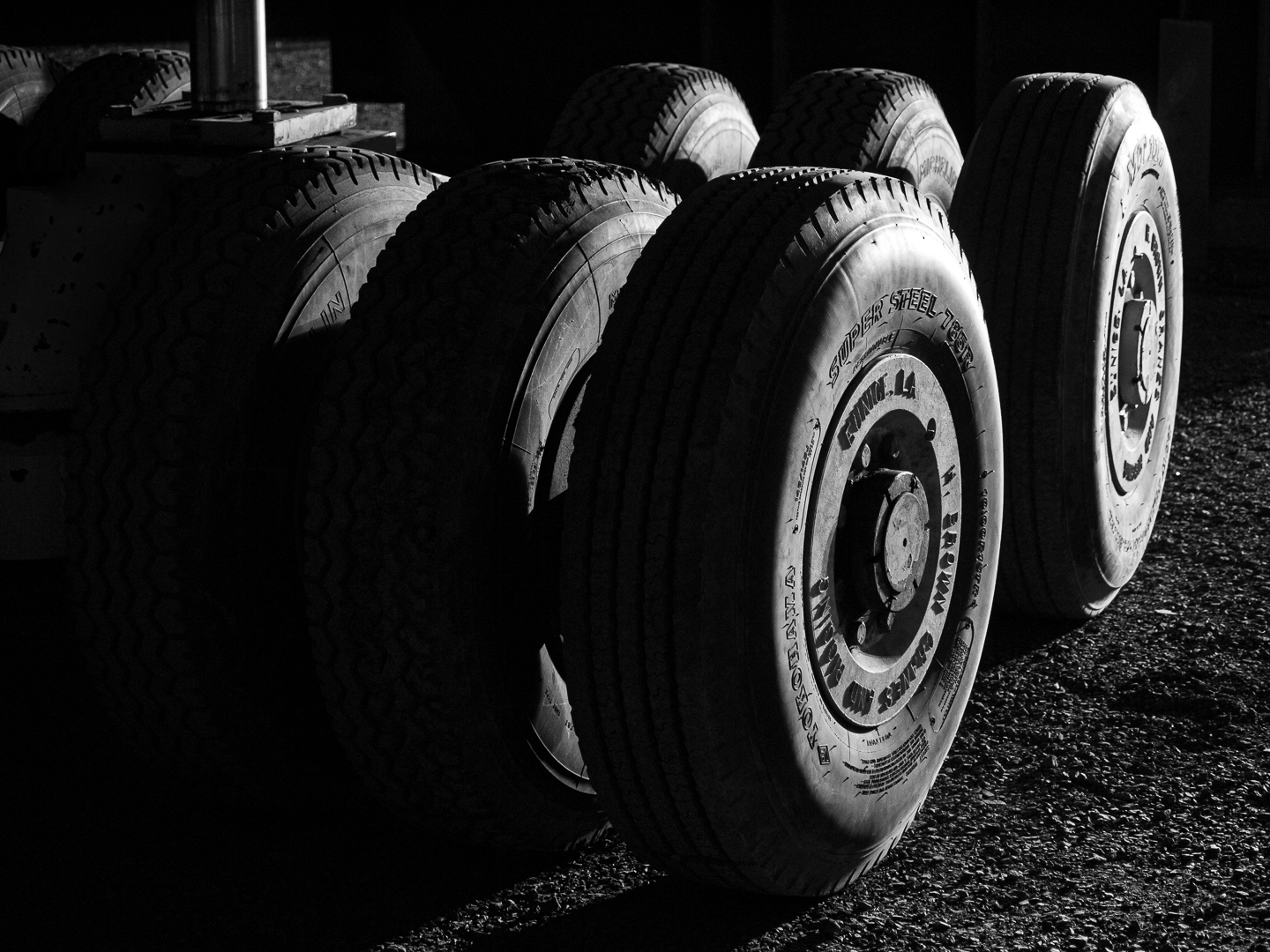 Color balance with artificial lights can be very tricky. Here we see an orange hue to these black tires that comes from the light source, in this case a street light that shines into the shipyard. By converting to b/w, the image looks "normal" and even dated. This helps this image feel like it belongs in a film noir picture. |