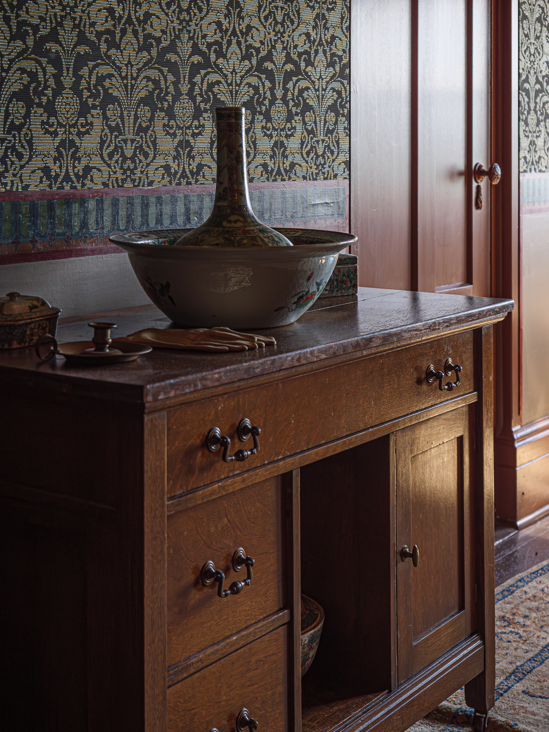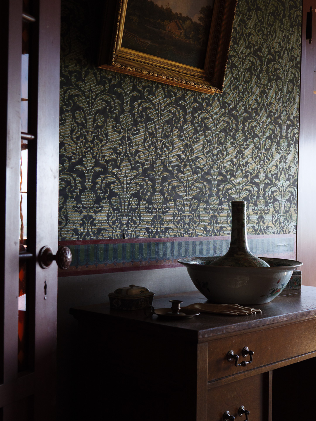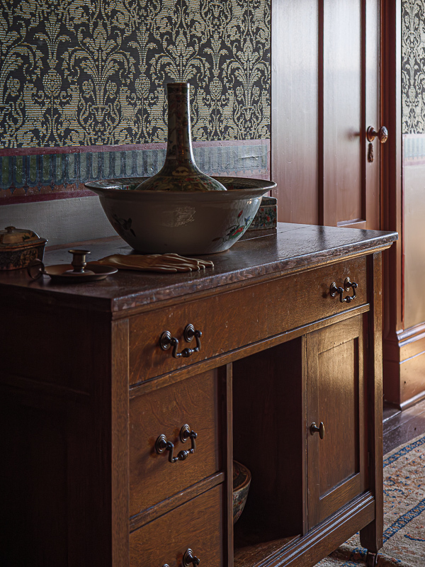 Eliminate, eliminate, eliminate the unnecessary. I leaned into the room and recomposed to get the view at left. Much better by the simple elimination of the door, picture and the additional light reflections off the door in the cabinet. I didn't even see the glove while I was there, but it looks great in the finished shot. |