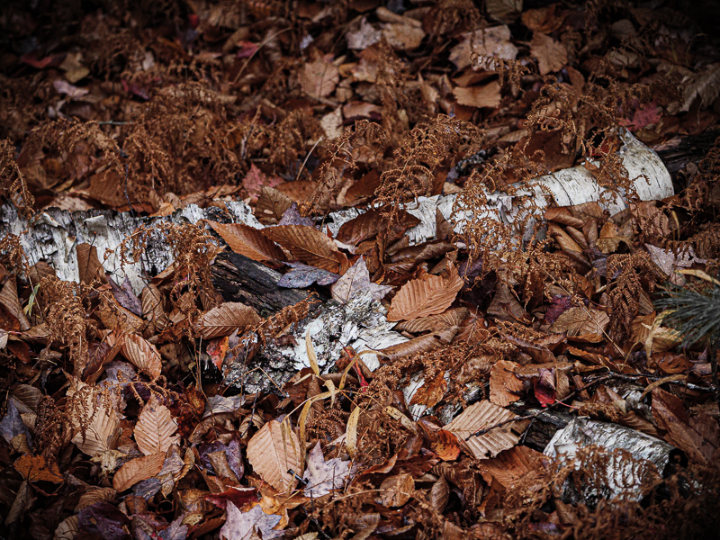 I've preached for years that photography is about relationships. The image at left illustrates this principle very well. Compared to the above, the version at left is about the relationship between the copper colored leaves and the bark of the fallen birch tree limbs. Look for relationships and you can't go wrong.