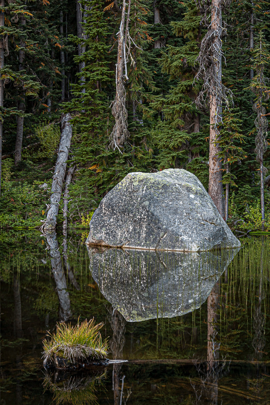 I think both the color and the monochrome versions of this subject work just fine. The orientation is the key difference here and that factor alone would probably push me into final use decisions based on the project and which version fits most comfortably. That said, I prefer the color version at left from a compositional point of view. That tuft of grasses in the lower left is a nice counter point to the big rock and the trees above.